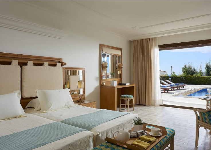 - Phaidra suite (rannas, 2 magamistuba (üks magamistuba kirjutuslauaga), 2 üheinimese voodit igas magamistoas, lisavoodi – üheinimese voodi, elutuba söögitoaosaga, 1 vannituba jacuzzi, 1 WC duššiga, terrass pääsuga ind. basseini äärde, mahub 5 in., 110 м2).